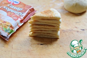 Равномерно присыпать поверхность лепешки коричным сахаром (примерно 0,5 ч. л., больше или меньше, это дело вкуса), отступив от краев по 1 см. Я использую сахар с корицей Dr. Oetker. За неимением такого просто смешайте мелкий сахар с корицей.