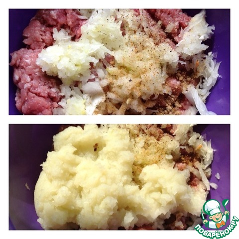 Капусту нашинковать и отварить в подсоленой воде. Готовую капусту откинуть на дуршлаг, чтобы стекла лишняя жидкость. Тем временем к фаршу добавить чеснок пропущенный через пресс и лук натертый на крупной терке. Добавить специи. Остывшую капусту пюрировать блендером и выложить капустное пюре к фаршу. Тщательно вымесить фарш.