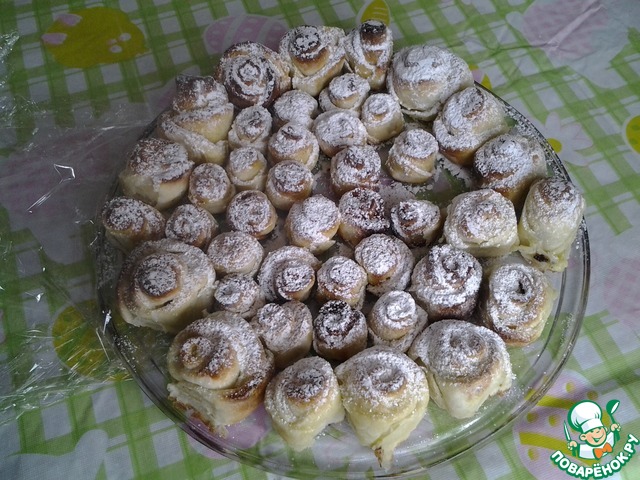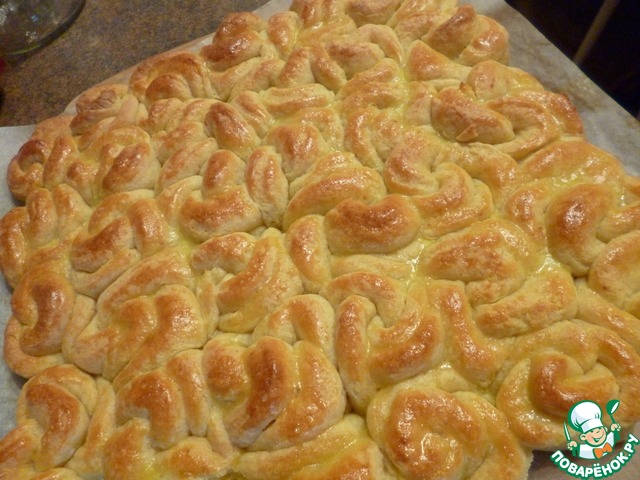 Выкладываем " розочки" на противень застеленный пергаментной бумагой.