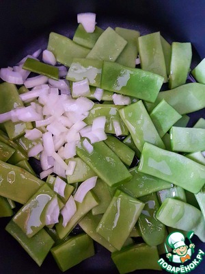 В кастрюле с толстым дном на растительном масле коротко обжарить лук и фасоль. Если фасоль немолодая, то предварительно убрать с неё "усики".