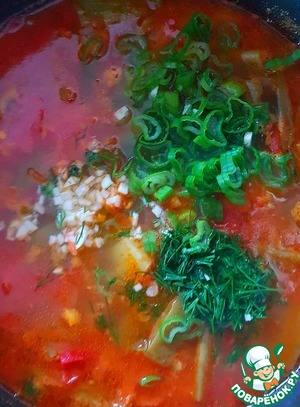 Добавить в суп мелкорубленный чеснок и зелень. Досолить, если требуется. Снять с огня и дать настояться. При подаче поперчить.