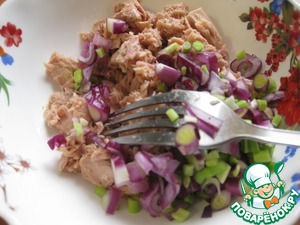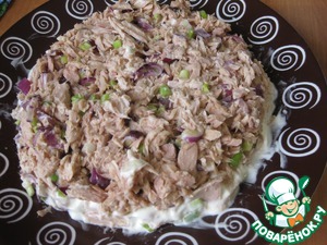 Вторым слоем выложить тунец с луком, этот слой я не смазывала
