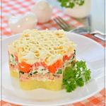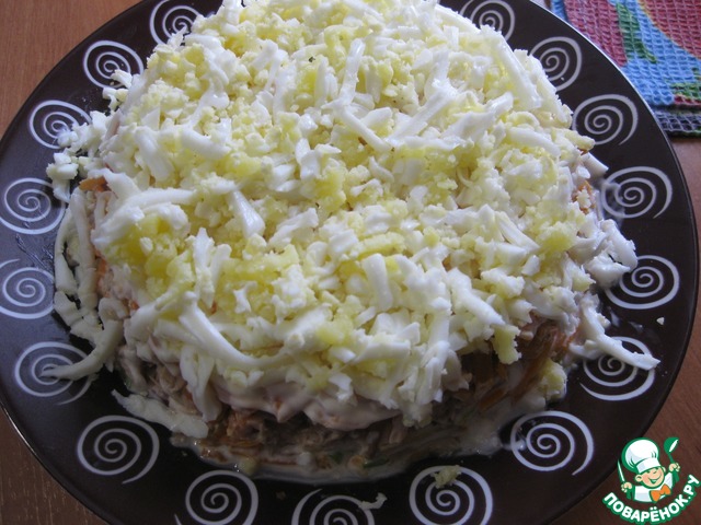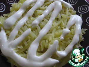 На сервировочное блюдо первым слоем (салат слоеный) натереть на терке картофель и смазать его майонезом