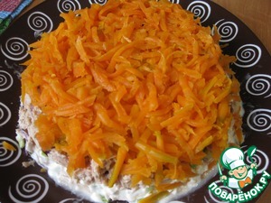 Затем трем морковь, майонез тут по желанию, я немного все же смазала