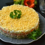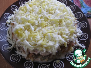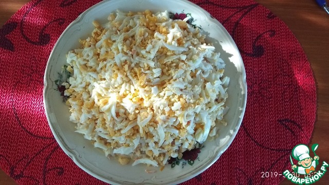 И последним слоем яйца, - тут их можно использовать и в качестве украшения, - один желток можете раскрошить сверху. Я просто натерла их на терке