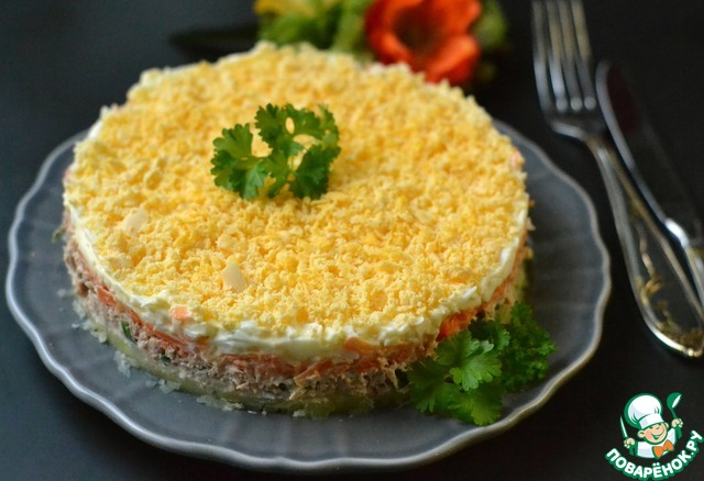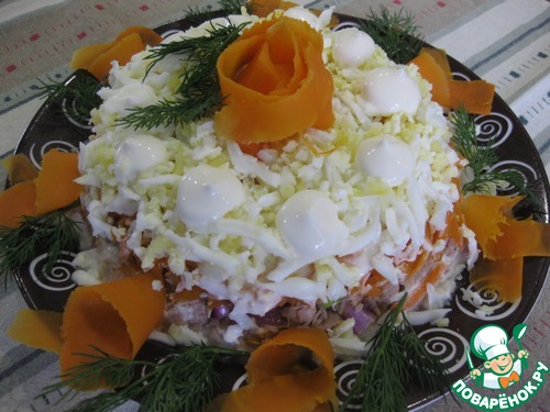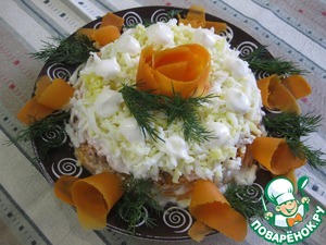 В качестве украшения использовала ленты из вареной моркови, свежий укроп и майонез. Дать салату настояться в холодильнике 1-2 часа и можно подавать на стол!