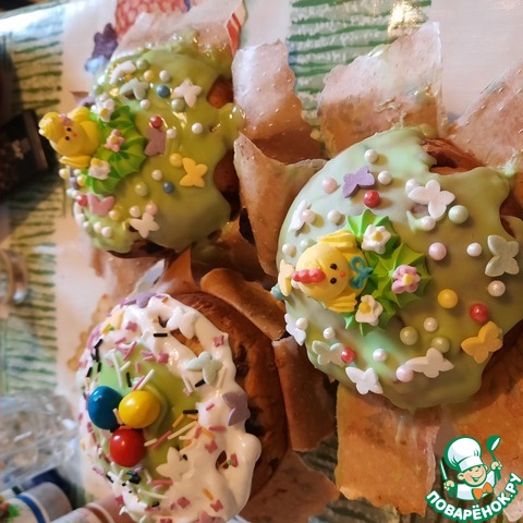 Теперь берем куличи и опускаем их прямо в глазурь. Кулич очень равномерно покрывается глазурью. -