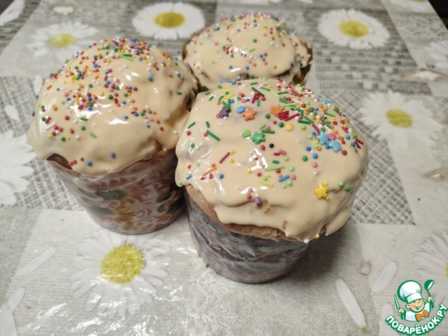 Готовность куличей проверяйте деревянной шпажкой, чтобы она выходила полностью сухая. У меня куличи выпекались 40 минут.