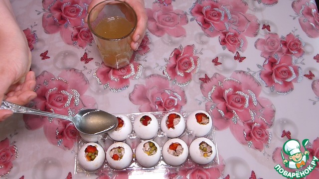 Закладываем поочередно в скорлупу от яиц подготовленные ингредиенты: