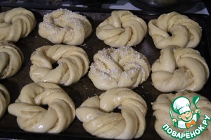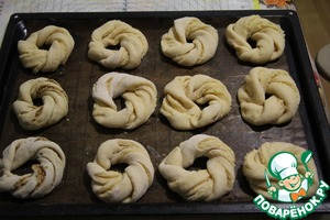 Булочки уложить на противень, накрыть полотенцем и отправить на расстойку в теплое место около 1 часа до увеличения объема в 2 раза.