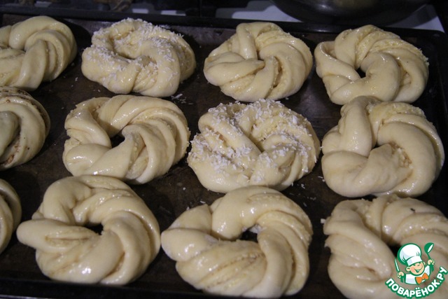 Смазать булочки взбитым яйцом. Некоторые можно посыпать сверху кокосовой стружкой.