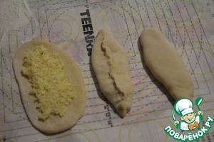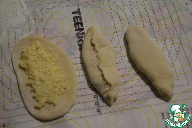 Каждый шарик раскатать в овал и распределить начинку. Края защипнуть, приплюснуть и вновь раскатать.