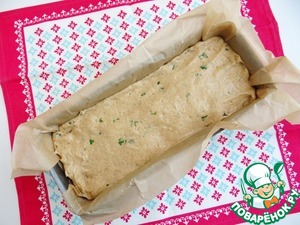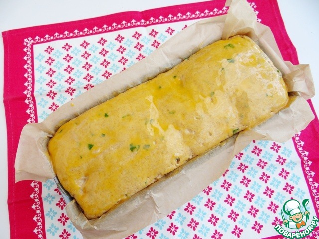 Прямоугольную форму размером 10*25 см застилаю пергаментом, смазываю растительным маслом. Распределяю в форме 1/2 часть теста, затем выкладываю печень.