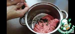 Подготовим фарш. Добавим в него свежий розмарин, тимьян, базилик. За неимением свежих вполне можно обойтись сушеными. Их не требуется много.