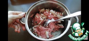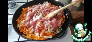 Выкладываем на сковороду фарш и тщательно перемешиваем, чтобы не было больших комочков.