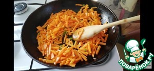 В сковороде разогреваем немного растительного масла и добавляем кусочек сливочного. Пассируем морковь и сельдерей 2-3 минуты. -