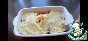 В форму для выпечки выкладываем сначала фарш, сверху распределяем пюре. Я ещё решила сделать бороздки вилкой.