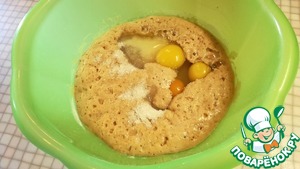 Добавить тёплую воду, сахар, соль, яйца. Всё перемешать.