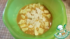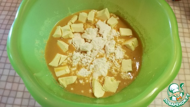 Добавить размягчёное сливочное масло, рикотту и творог. Хорошо перемешиваем.