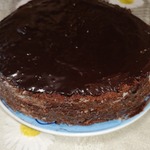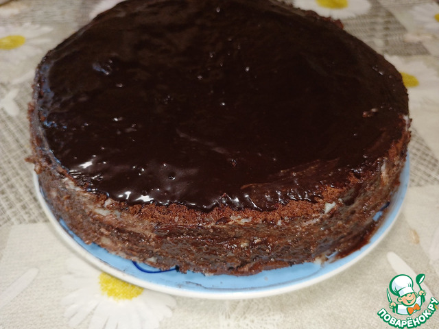 Разрезаем бисквит на две части. Можно пропитать сиропом. На нижнюю часть коржа выкладываем крем и накрываем верхней частью. Сверху поливаем шоколадной глазурью.