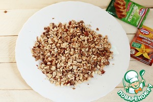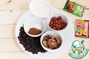Ядра грецкого ореха (50 г) и арахиса (50 г) ополоснуть и поджарить на сковороде или в микроволновой печи, чтобы они раскрыли в выпечке свой аромат. Остудить и порезать их ножом на небольшие кусочки, удаляя при необходимости отделяющуюся оболочку.