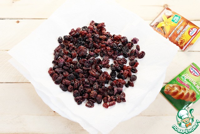 Изюм перебрать от плодоножек, промыть и распарить, залив кипятком. Затем обсушить в дуршлаге или на полотенце.