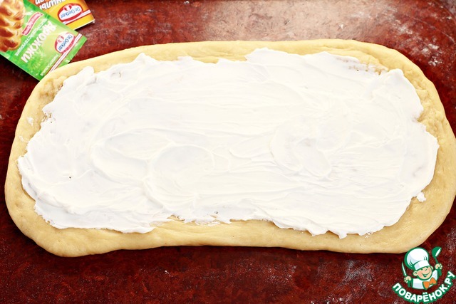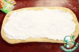 Подошедшее тесто на припыленной тонким слоем пшеничной мукой поверхности (в случае липкости) растянуть в пласт длиной 30–40 см и шириной 12–13 см. Не стоит делать пласт очень тонким, иначе при расстойке могут получиться нежелательные рваные отверстия на поверхности. Не заходя на края пласта (как на фото), намазать равномерным слоем сыр (140 г).