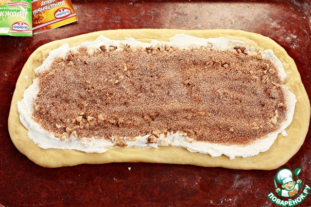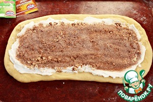 когда раскатывала тесто разделила его на две части, раскатала потоньше и сделала два слоя: тесто, сыр, корица, орехи, снова тесто, сыр, корица, орехи.