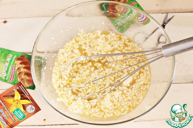 Молоко (100 мл) подогреть, чтобы стало чуть горячим, растворить в нем соль (1/3 ч. л.), сахарный песок (4 ст. л.), ванильный сахар Dr.Oetker (1 пак. - 9 г). Полученную смесь охладить до температуры, комфортной для активации дрожжей Dr.Oetker, добавить их (1 пак. - 7 г) и распустить.