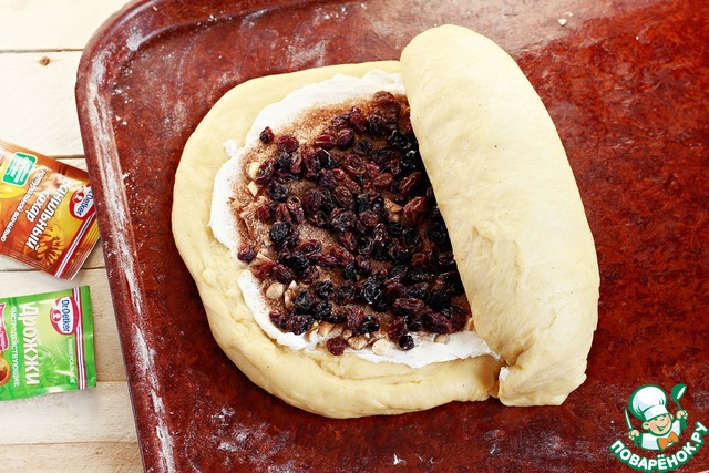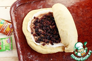 Равномерно выложить обсушенный изюм, аккуратно придавить начинку ладонью. Свернуть заготовку в рулет, сразу защепляя торцы. Аккуратно защипнуть край, а торцы подвернуть внутрь рулета.