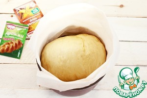 Емкость с тестом затянуть пищевой пленкой или накрыть крышкой и оставить для расстойки в теплом месте на 1,5–2 часа. Его объем за отведенное время увеличится в 1,5 - 2 раза.
