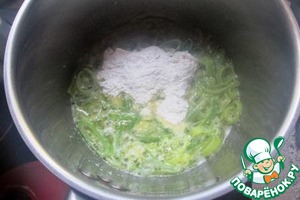 В кастрюлю с луком засыпать муку и добавить соль, перемешать и готовить 3 минуты.