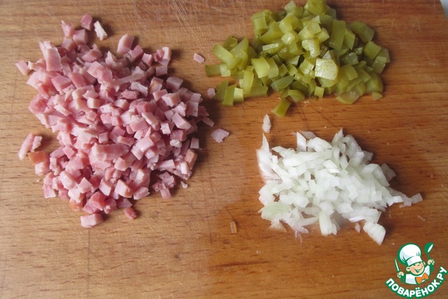 Ветчину, огурцы и лук нарезаем очень мелким кубиком. -