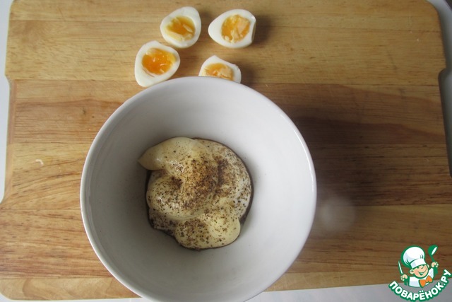 Яйца сварим вкрутую, очистим от скорлупы и разрежем вдоль пополам.