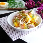 Раскладываем по порционным плошкам, сверху укладываем половинку (четвертинку, кружок) яйца, на яйцо капаем каплю майонеза и присыпаем рубленым укропом. Можно всю эту красоту выложить на кружок ржаного хлеба. Можно сделать в общей миске в виде салата. Творите по своему усмотрению.