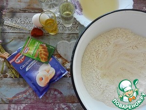 В миску насыпать муку. Сделать в середине углубление, всыпать сахарную пудру (Dr.Oetker), дрожжи (Dr.Oetker), соль, паприку. Добавить яйцо, вино, оливковое масло, смалец и воду. Руками подсыпая по немногу муку с краев замесить мягкое эластичное тесто. Мука, возможно, потребуется не вся (у меня немного осталось, потом использовала при раскатке).
