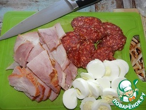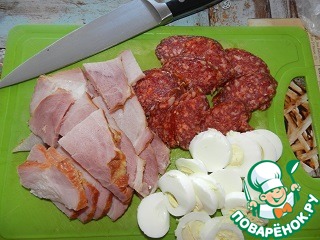 Подготовить начинку. Яйца отварить вкрутую, почистить, нарезать колечками. Окорок порезать тонкими пластинками, тут можно взять любые мясные продукты (грудинку, сыровяленную свинину или говядину, ветчину, вообщем на любой вкус). Чоризо порезать колечками (если другие варианты колбасы, то лучше брать пряные).