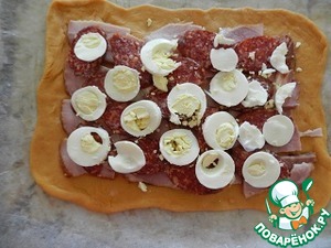 Выложить на тесто начинку слоями - окорок, чоризо, сверху колечки яиц. -