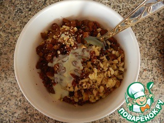 Изюм и грецкие орехи измельчить, добавить к подготовленной крошке и 3 ст. л. сгущенки, перемешать ложкой до однородной массы. -