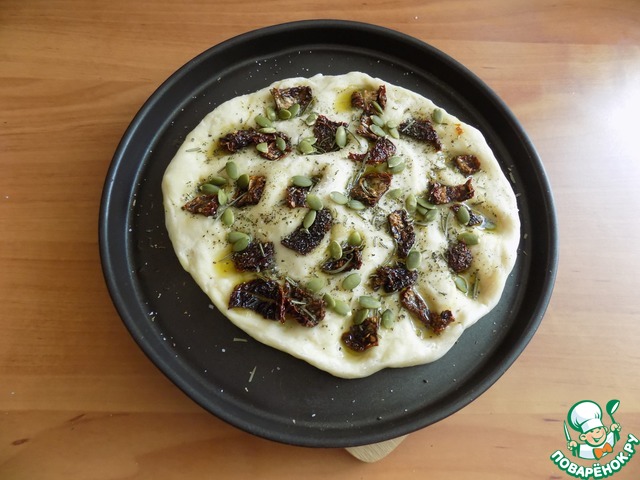 Сегодня я на неё уложу вяленые помидоры, семечки, посыплю базиликом и розмарином сухими-такой праздничный вариант. Ставлю в разогретую духовку до т-180-200 С на 15 минут.