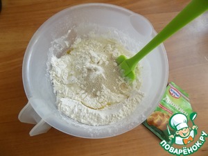 Делаем тесто. Муку просеиваем и добавляем к ней соль, сахар, дрожжи. Соединяем.