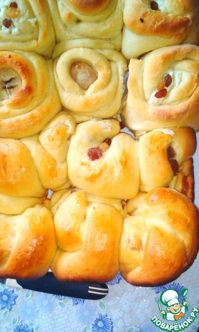 Для начинки я залила изюм на 20 мин кипятком, хорошо промыла и осушила салфетками. На фото с изюмом + творожной начинкой и бананом (розочки).