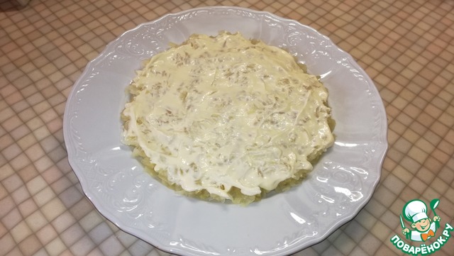 Выложить на блюдо для подачи первым слоем. Сверху смазать майонезом.