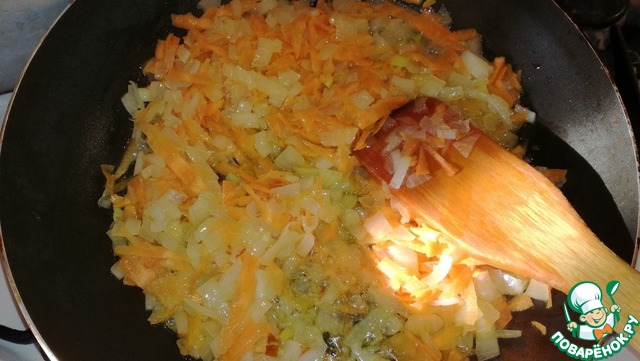 Морковь натереть на крупной тёрке. Лук порезать кубиком. Обжарить вместе на сковородке в небольшом количестве подсолнечного масла. Посолить и поперчить по вкусу.
