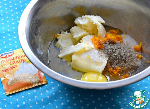 Мягкое сливочное масло смешать с сахаром, апельсиновым соком, сахаром ванильным, цедрой апельсина (1-2 ч. л, по вкусу), одним целым яйцом (С1) и одним яичным белком. Второй желток пока отставить в сторонку.