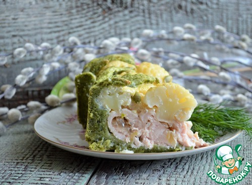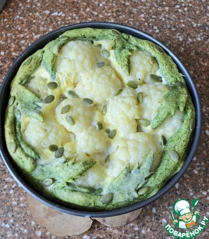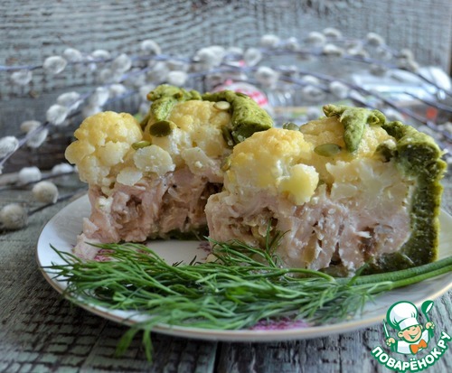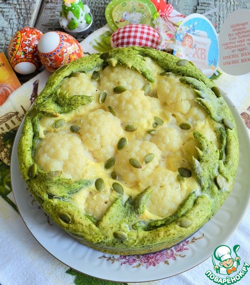 Обычный открытый пирог, но на праздник Светлой Пасхи я приготовила его на цветном тесте, с рулетиками из куриной грудки с жареным луком и цветной капустой. Именно, соцветия капусты схожи с барашками, поэтому они на зеленом лугу, среди сочной листвы. Думаю, такой пирог сможет украсить праздничный обед или ужин. Угощайтесь.