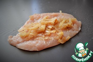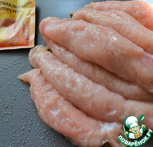 Куриную грудку нарезать пластами, 1 см. шириной.