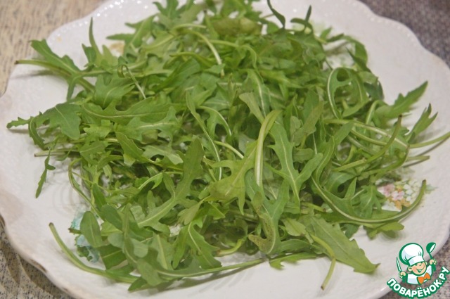 Листья рукколы промыть и обсушить (можно порвать на кусочки). Выложить на плоское блюдо.