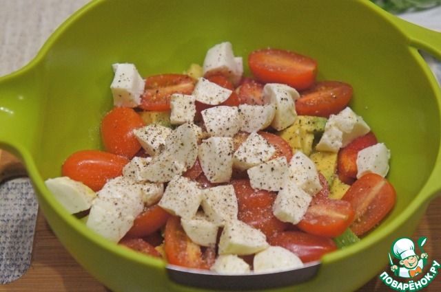 Моцареллу нарезать такими же кубиками. Посолить и поперчить по вкусу, заправить небольшим количеством соуса "Наршараб" и очень осторожно и аккуратно перемешать, стараясь не помять кусочки авокадо и моцареллы.