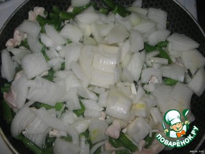 Когда грудка немного обжарится, добавить две луковицы, нарезанные соломкой. Посолить, поперчить - по вкусу.